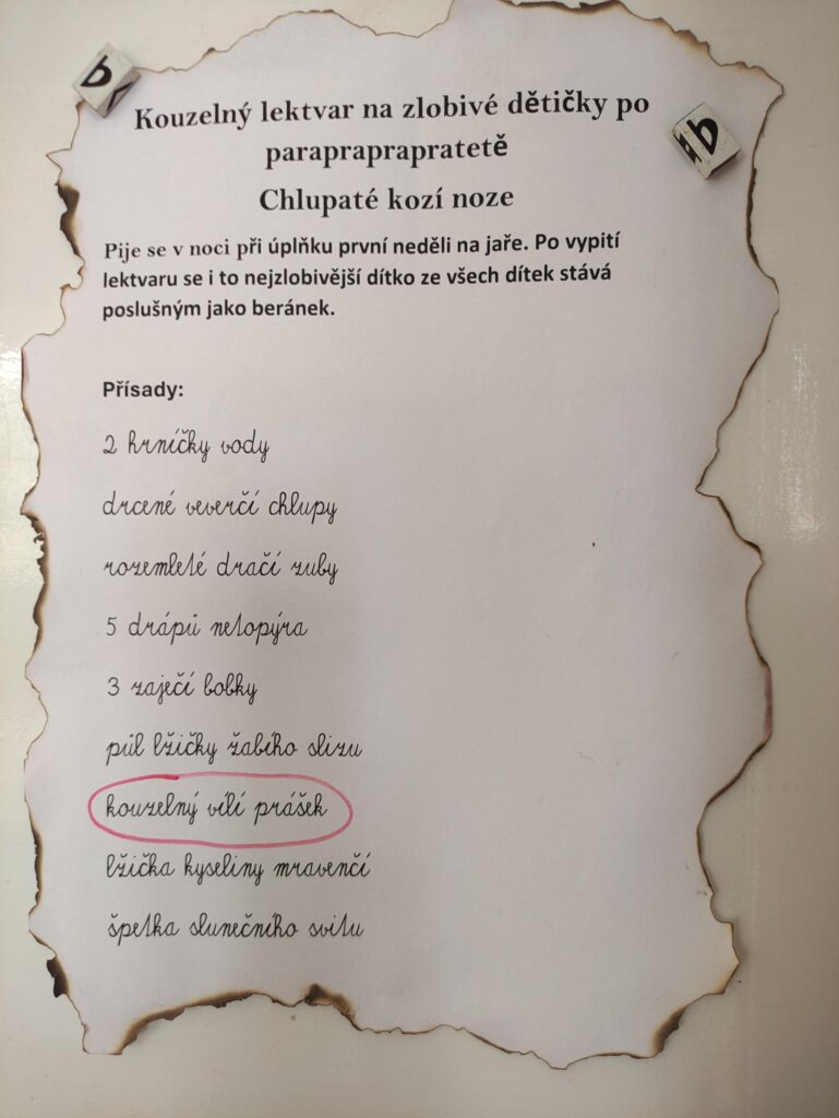 Další fazole jsme rozdávali v úterý za tělocvik, počítání v matematice a popis postavy v českém jazyce. Největším zážitkem dnešního dne bylo míchání lektvaru podle prastarého receptu, který nám ve třídě nechala praprapraprateta Chlupatá kozí noha. Recept si děti pak napsaly nad kotlík vytrhaný z papíru a dozdobily dýmem.